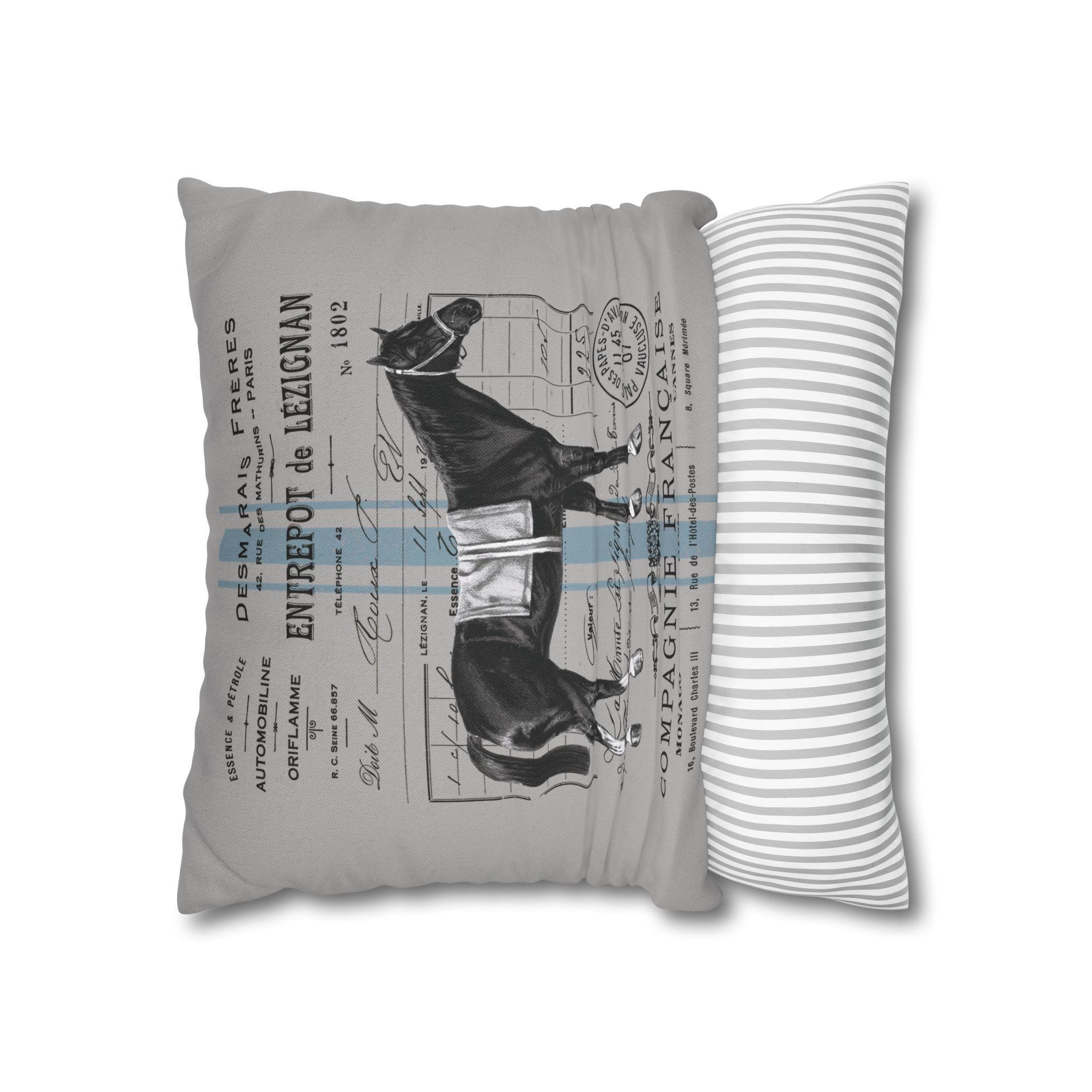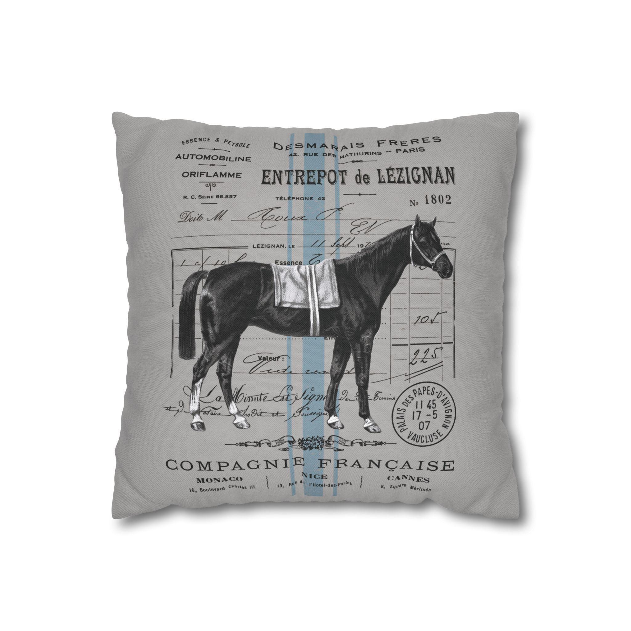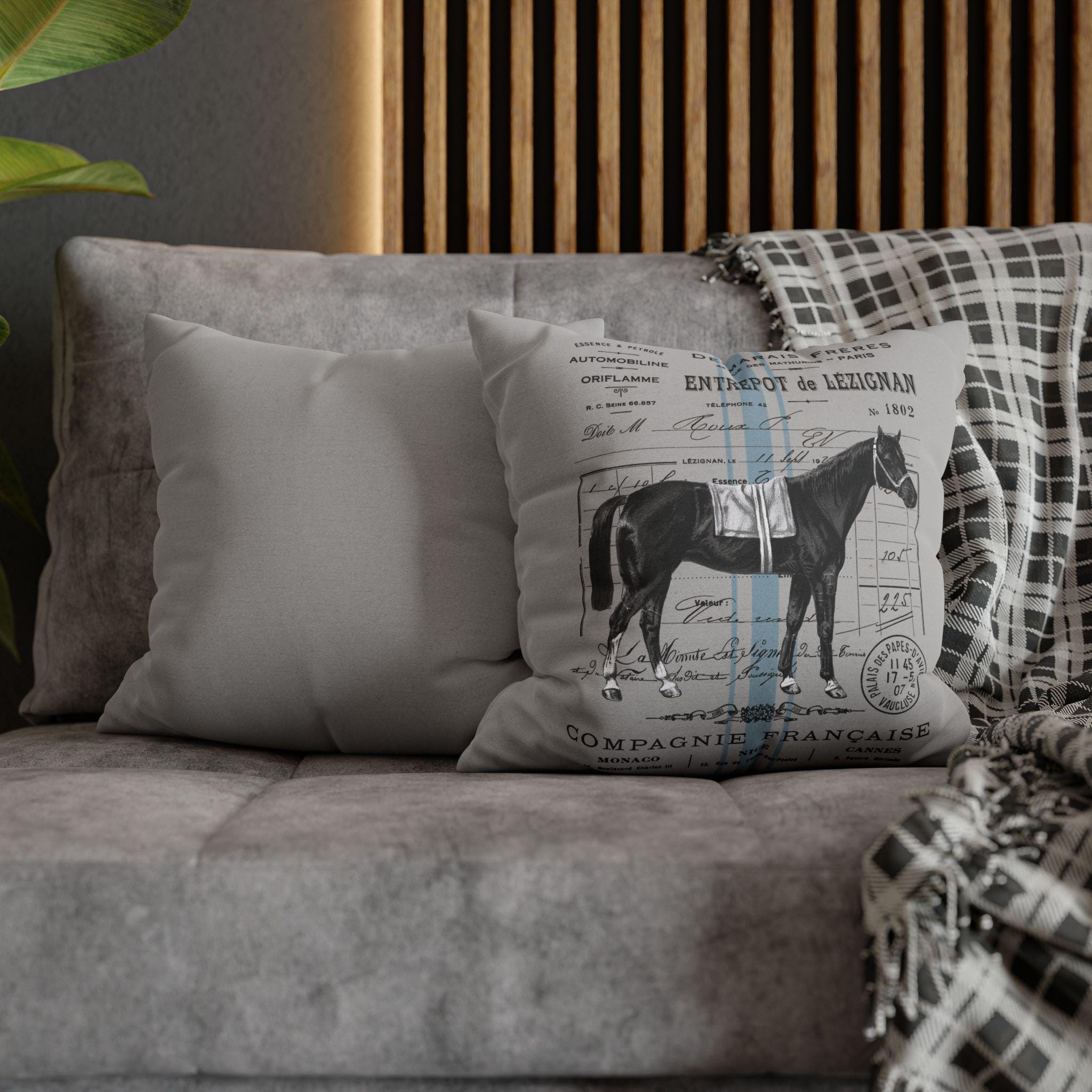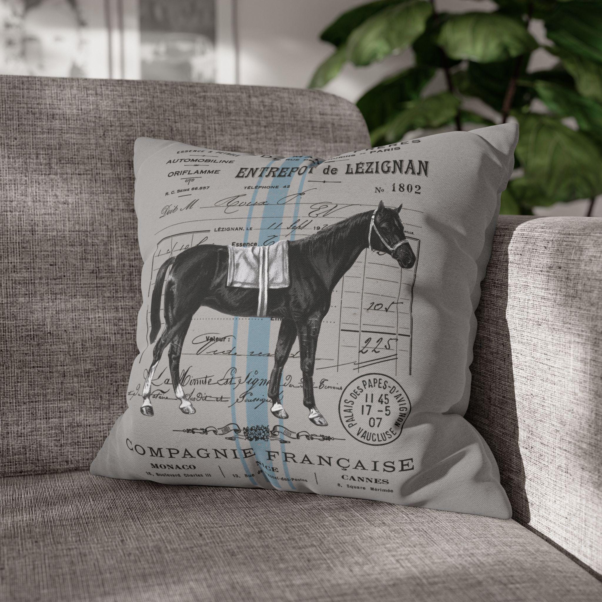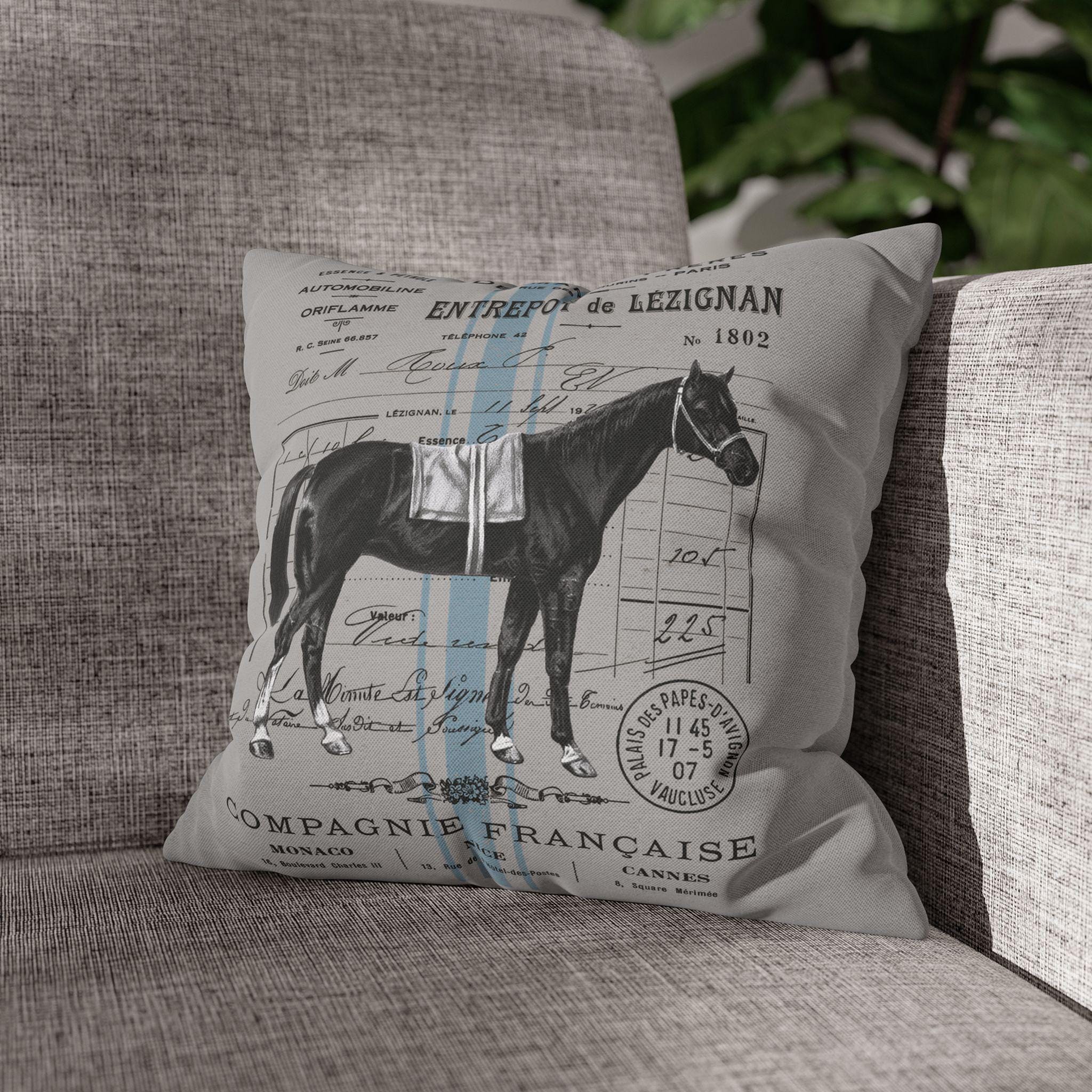 A soft, vintage-inspired square pillowcase that brings quiet equestrian charm to living spaces. The muted gray canvas-like background and detailed horse illustration evoke an old French ledger — weathered, elegant, and intentionally unfussy. A subtle vertical blue stripe and stamped script give the design a collected-over-time feel, while the concealed zipper and double-sided print keep the look polished from every angle. Slip it over your favorite insert to add layered texture to sofas, reading nooks, or a country-style bedroom. It’s for people who love lived-in character: collectors of flea-market finds, stable visitors, or anyone who wants a whisper of pastoral history in their home.