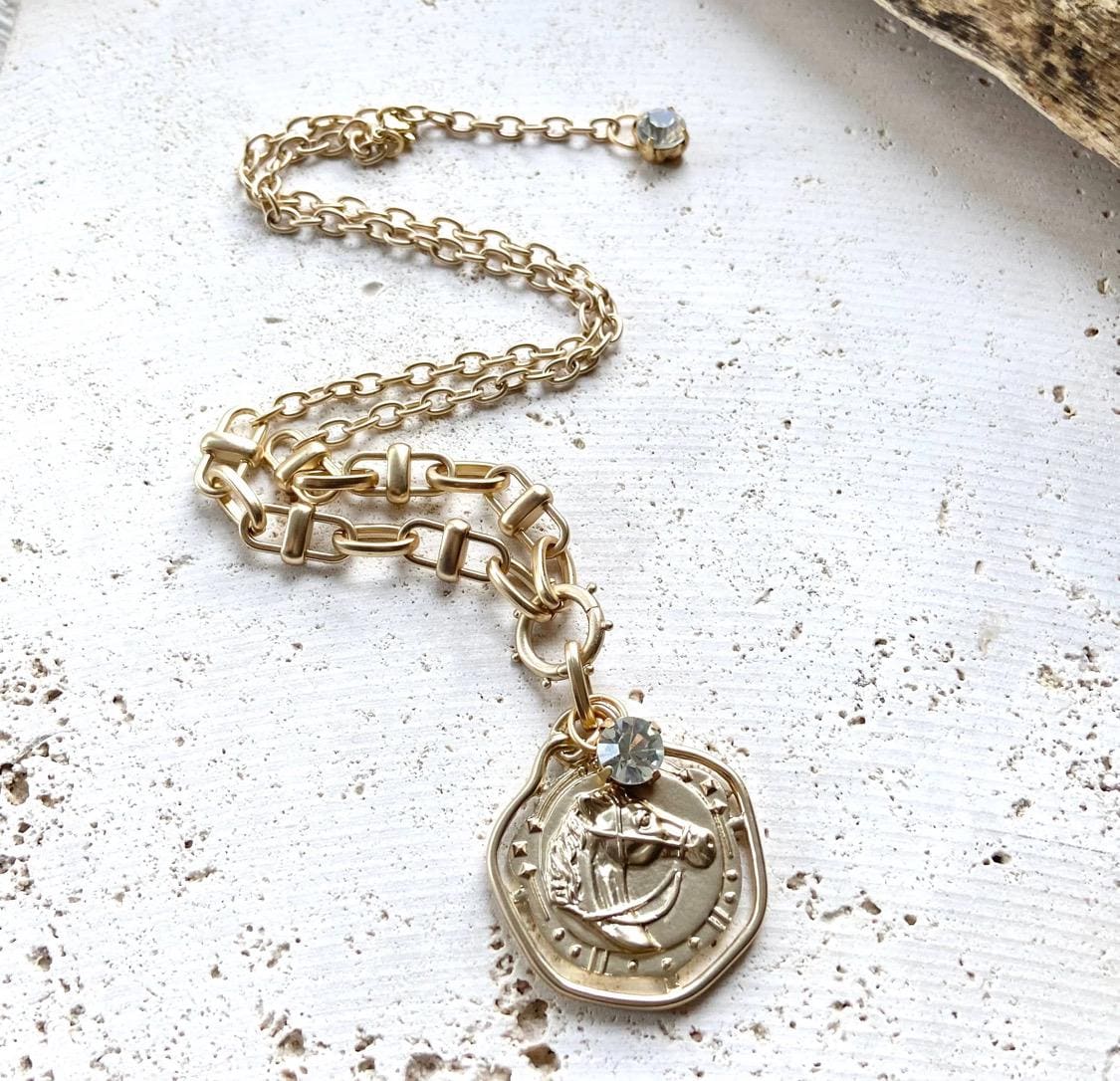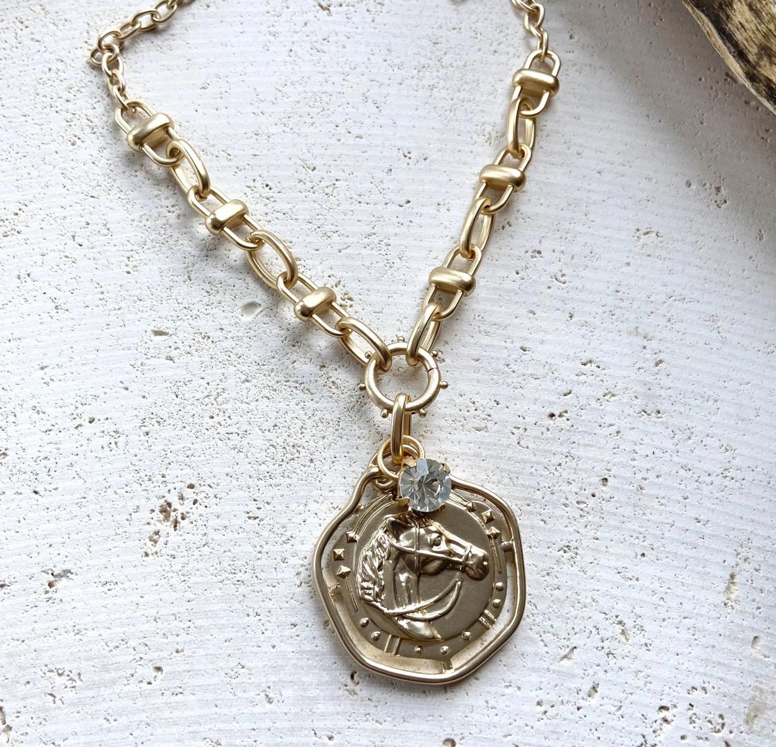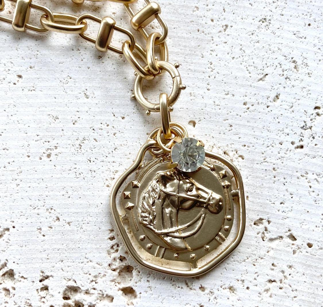 How cute is this matte gold horse necklace? We love the accent detailed chunky chain and the sparkly 8mm clear Swarovski crystal. Adjustable up to 19”.