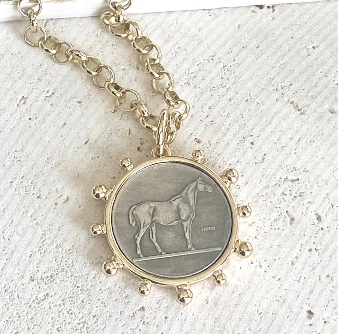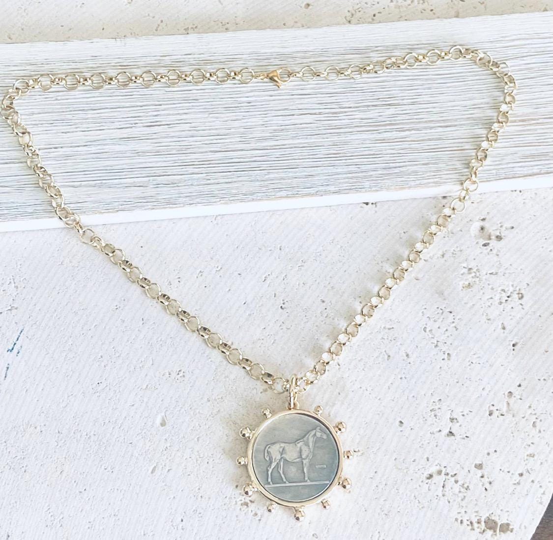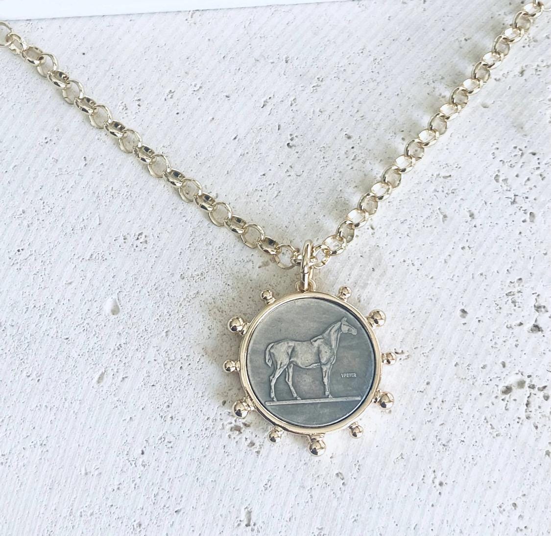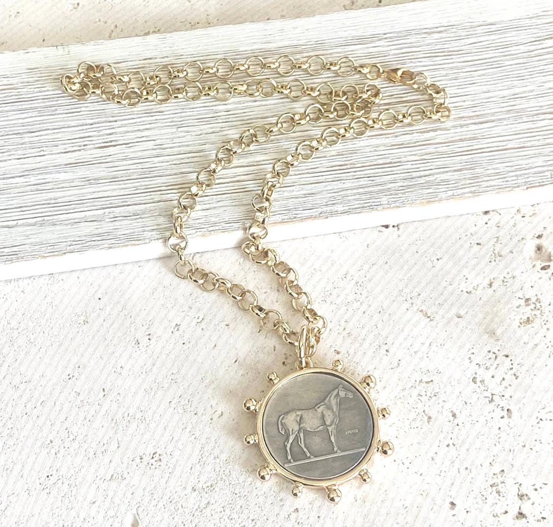 This simple horse coin necklace is on 6mm gold plated rolo chain. It is adjustable up to 19”