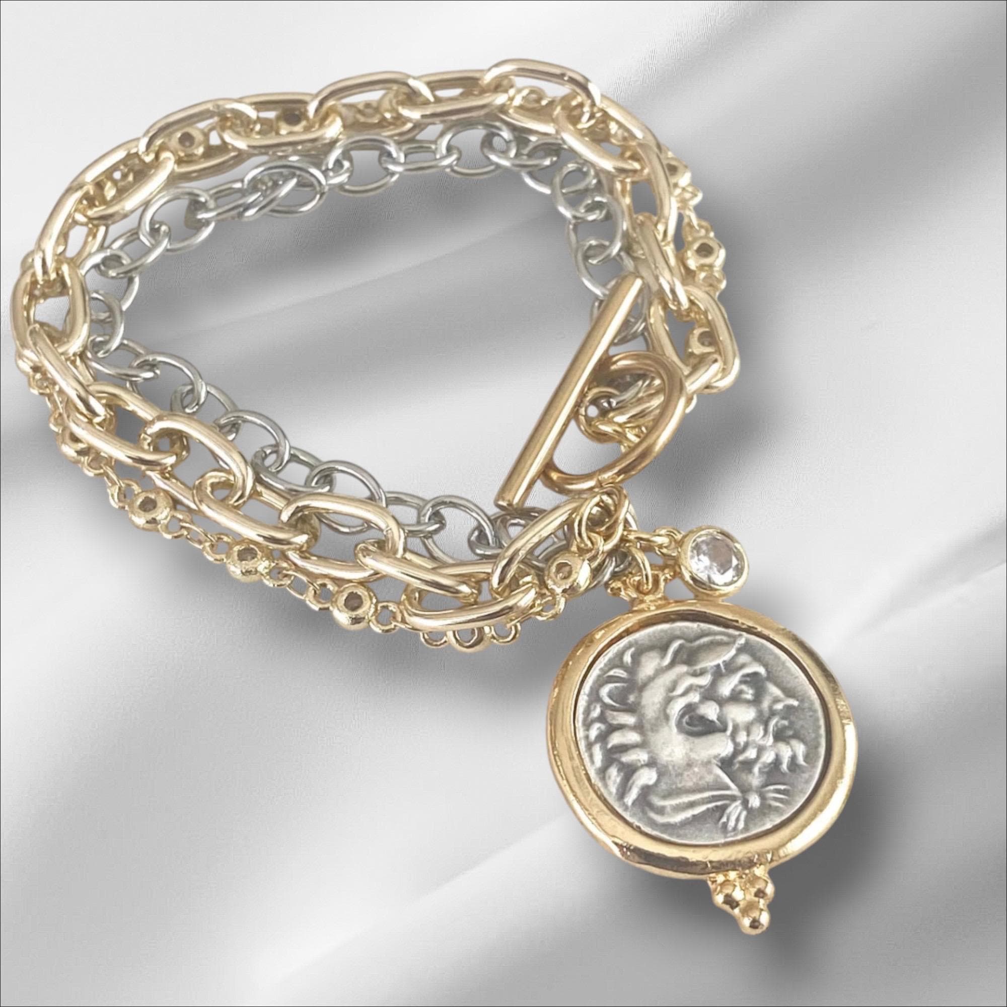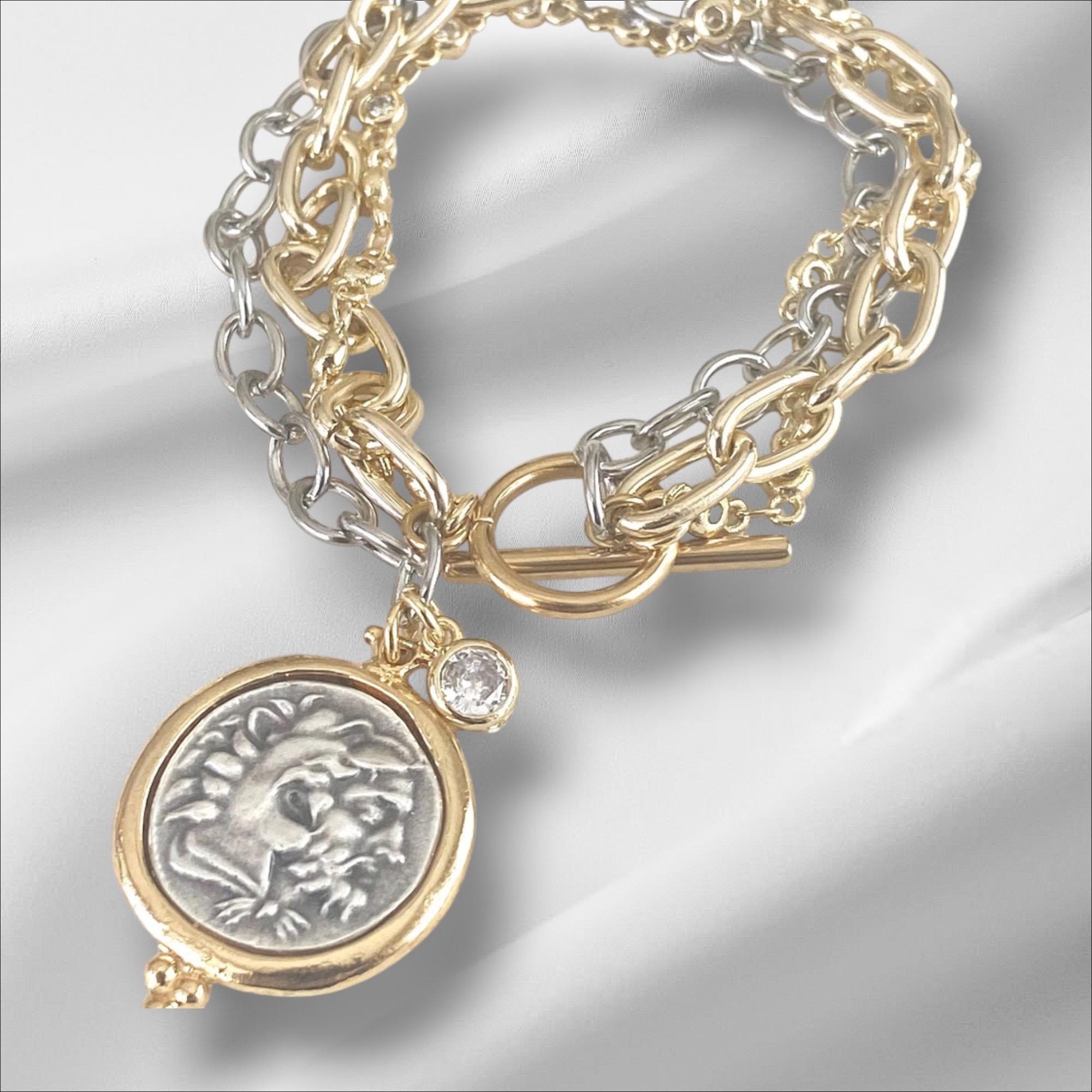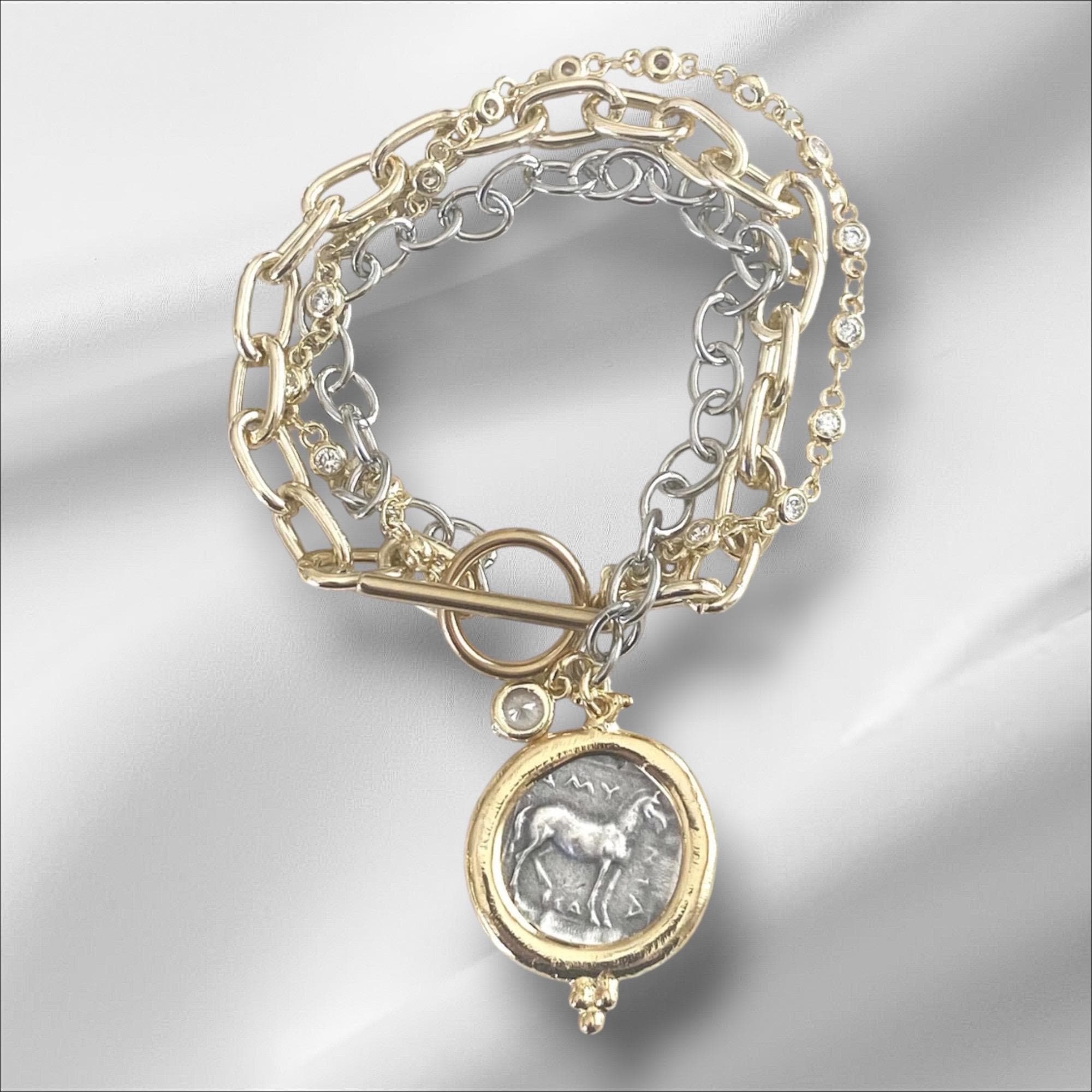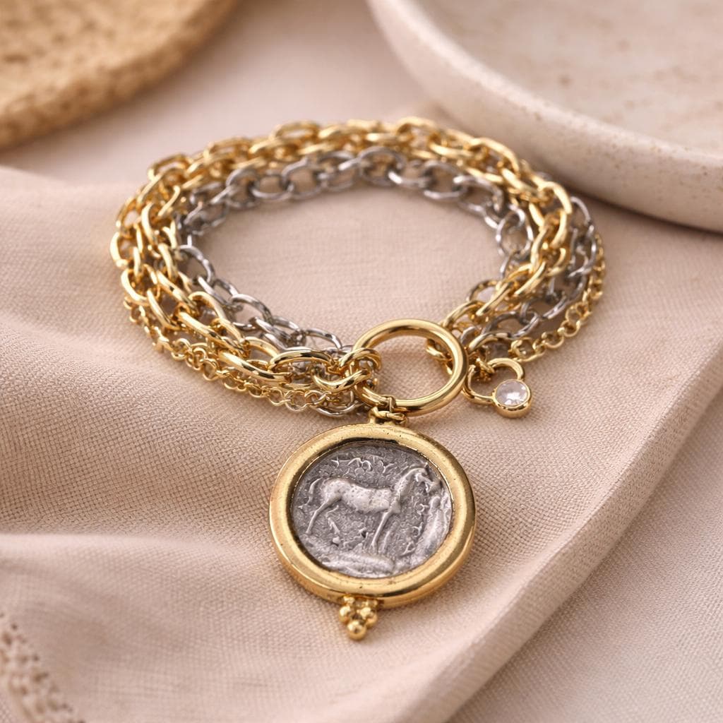 Triple Layer Greek Coin Bracelet • Reversible Horse Medallion, Gold Toggle Clasp