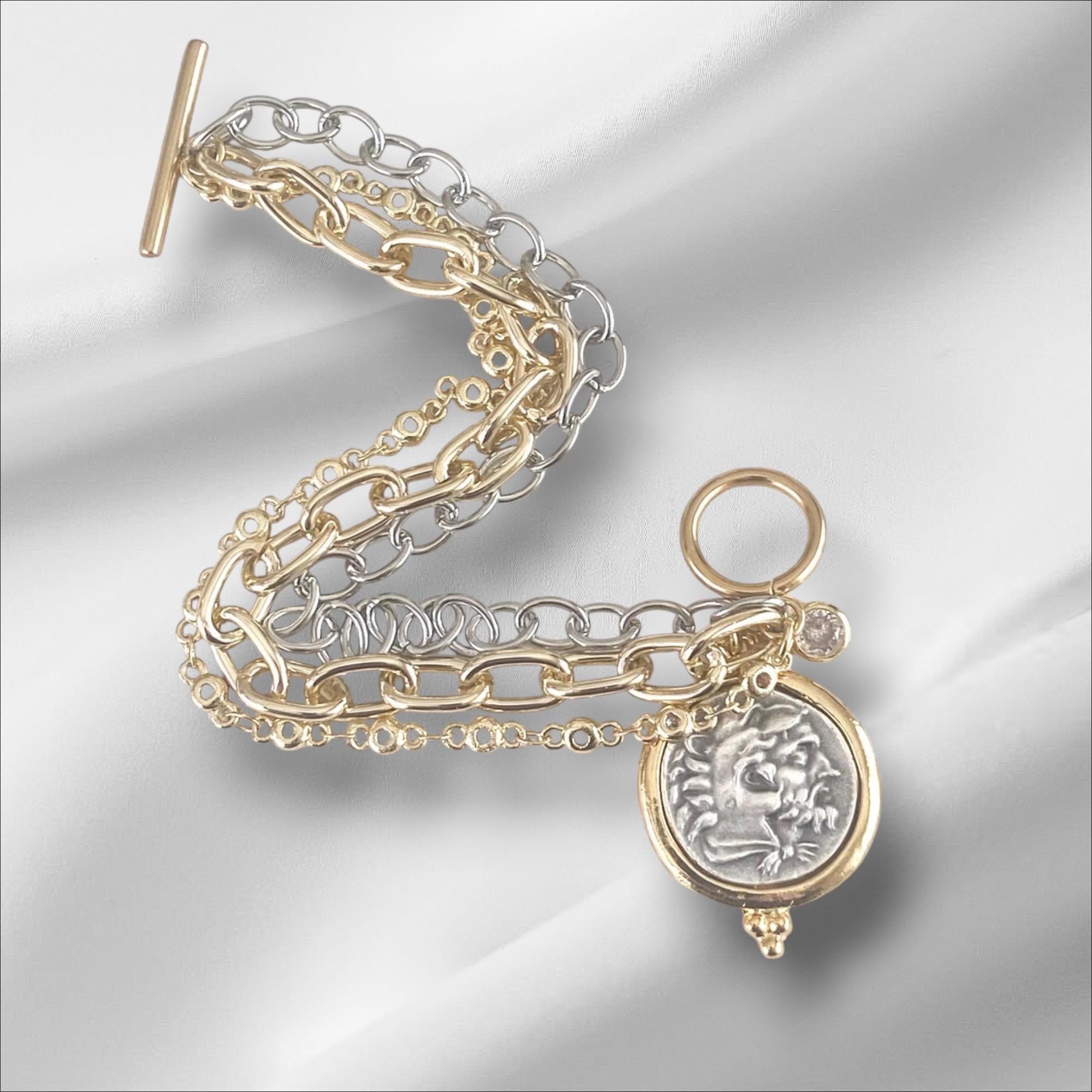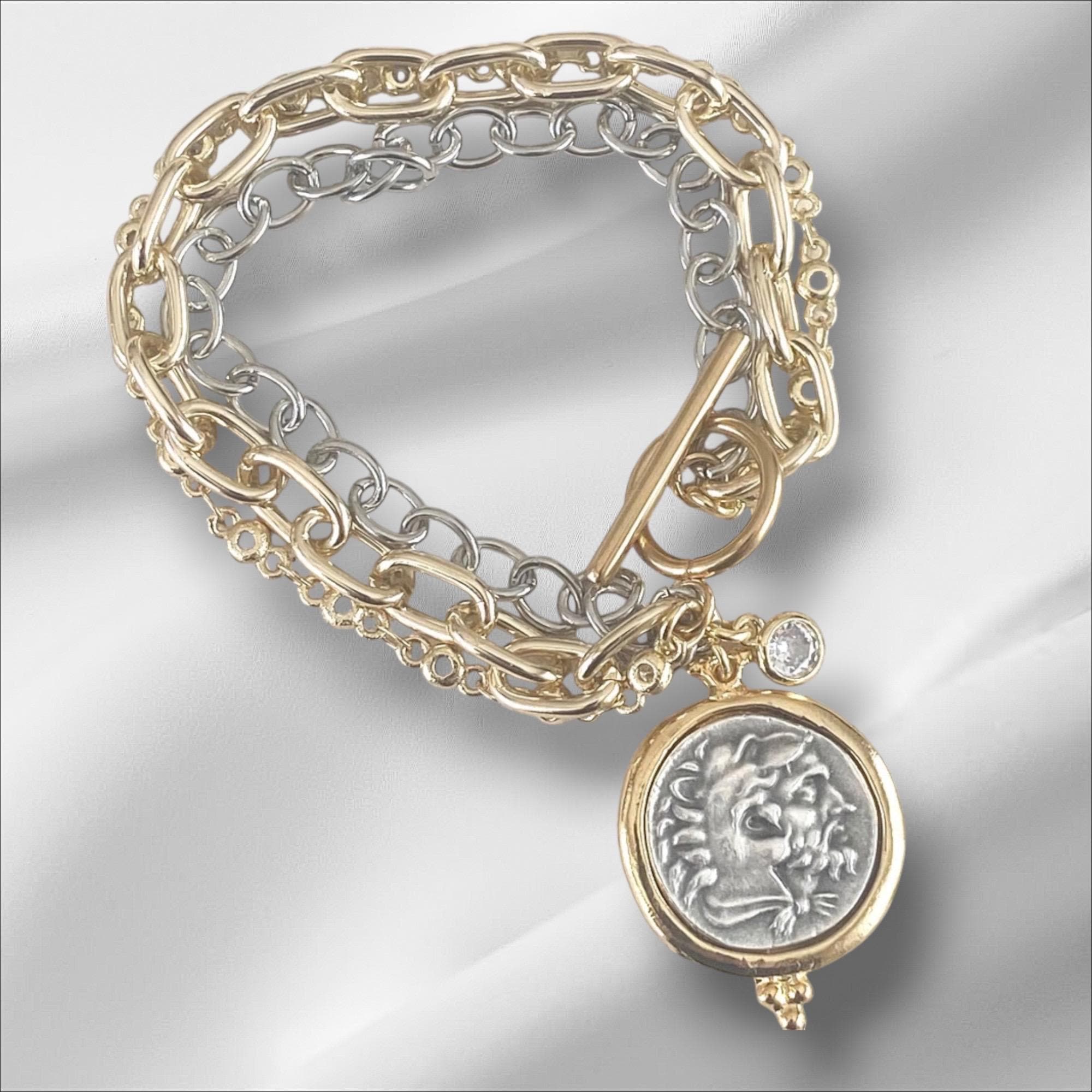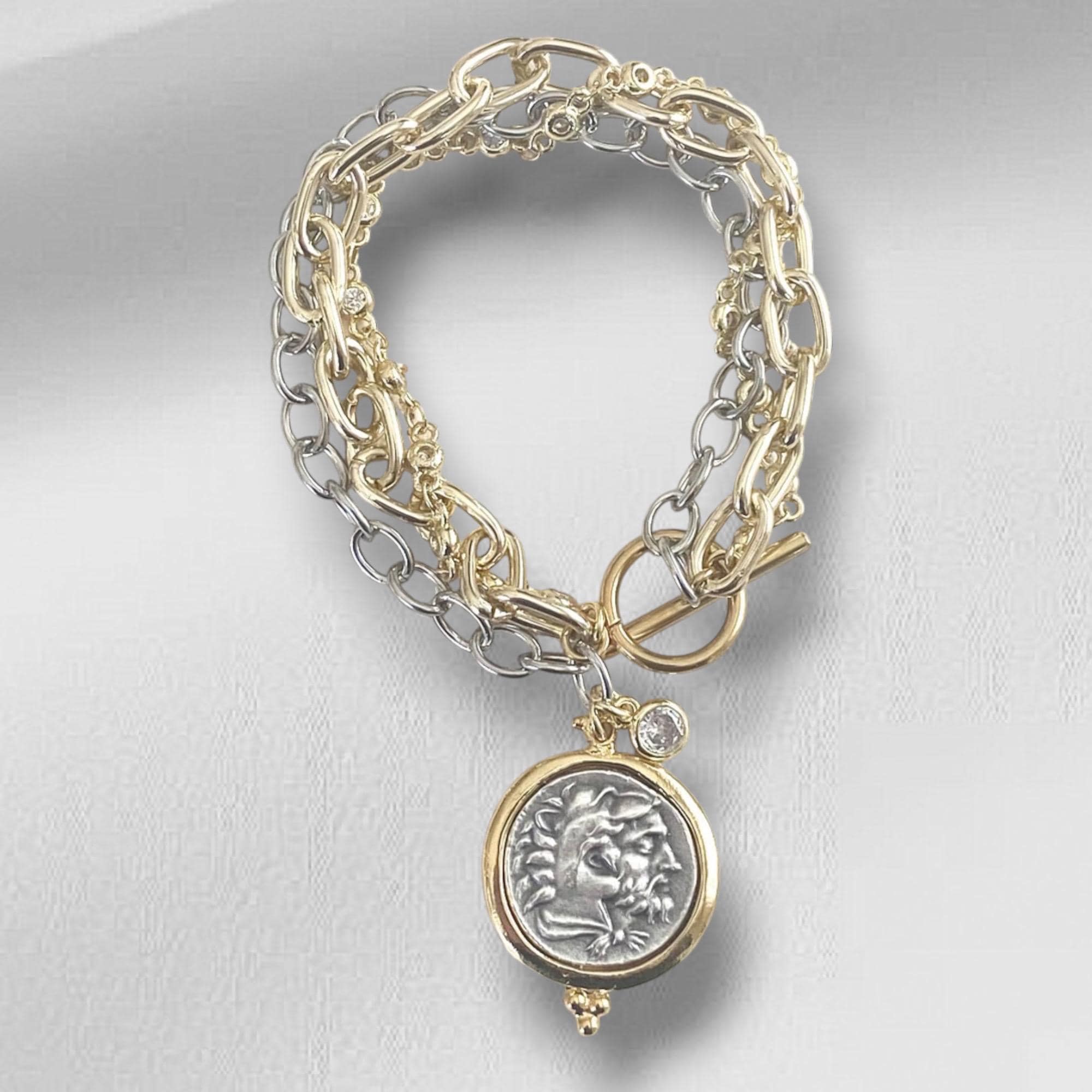 Triple Layer Greek Coin Bracelet • Reversible Horse Medallion, Gold Toggle Clasp