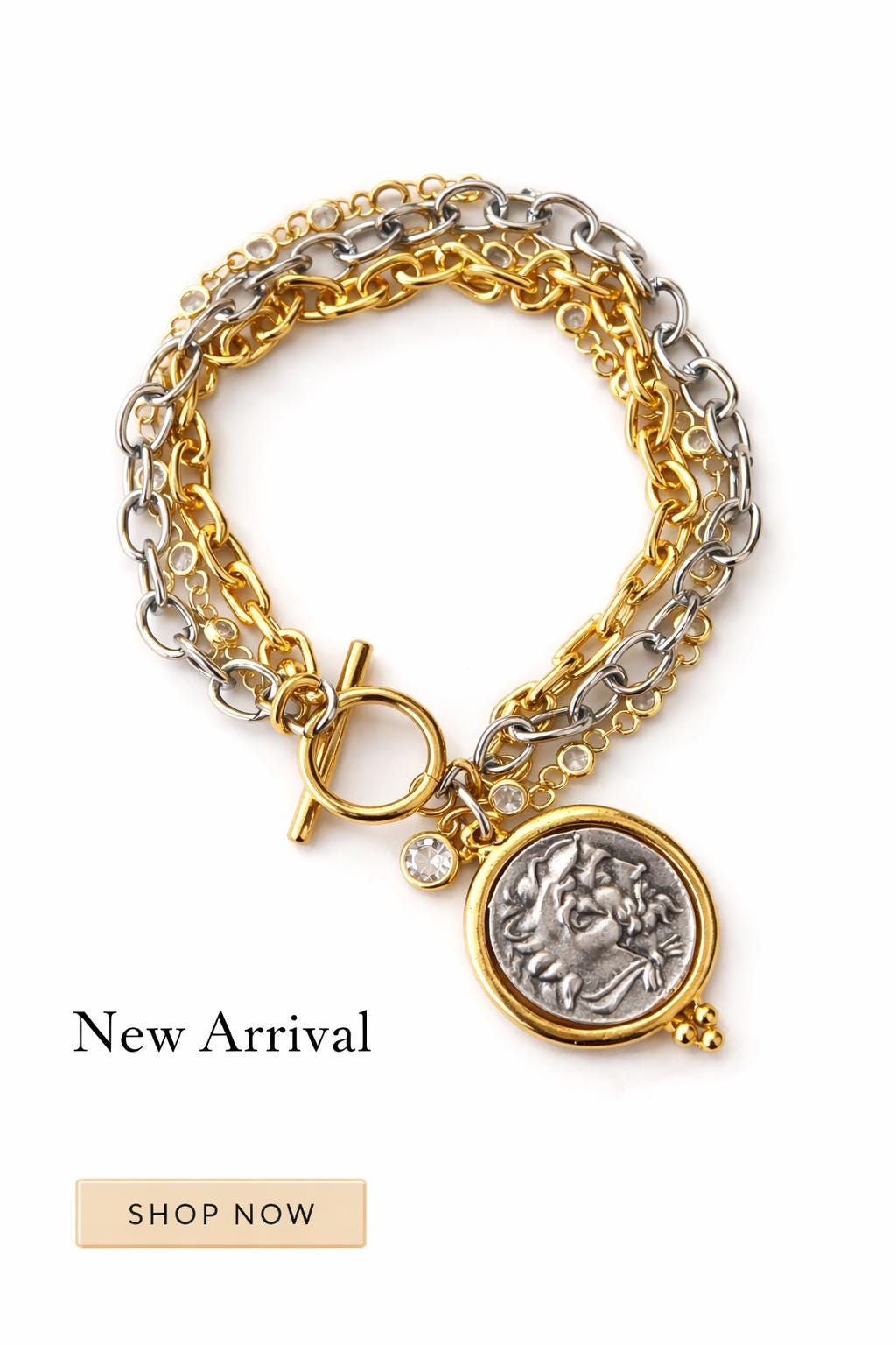 This triple layered Greek coin bracelet features a striking reversible coin charm with a classic face on one side and a horse on the other — giving you two looks in one piece. The layered design combines stainless steel, aluminum, and a crystal cubic zirconia chain for a mixed-metal style that’s both modern and timeless.