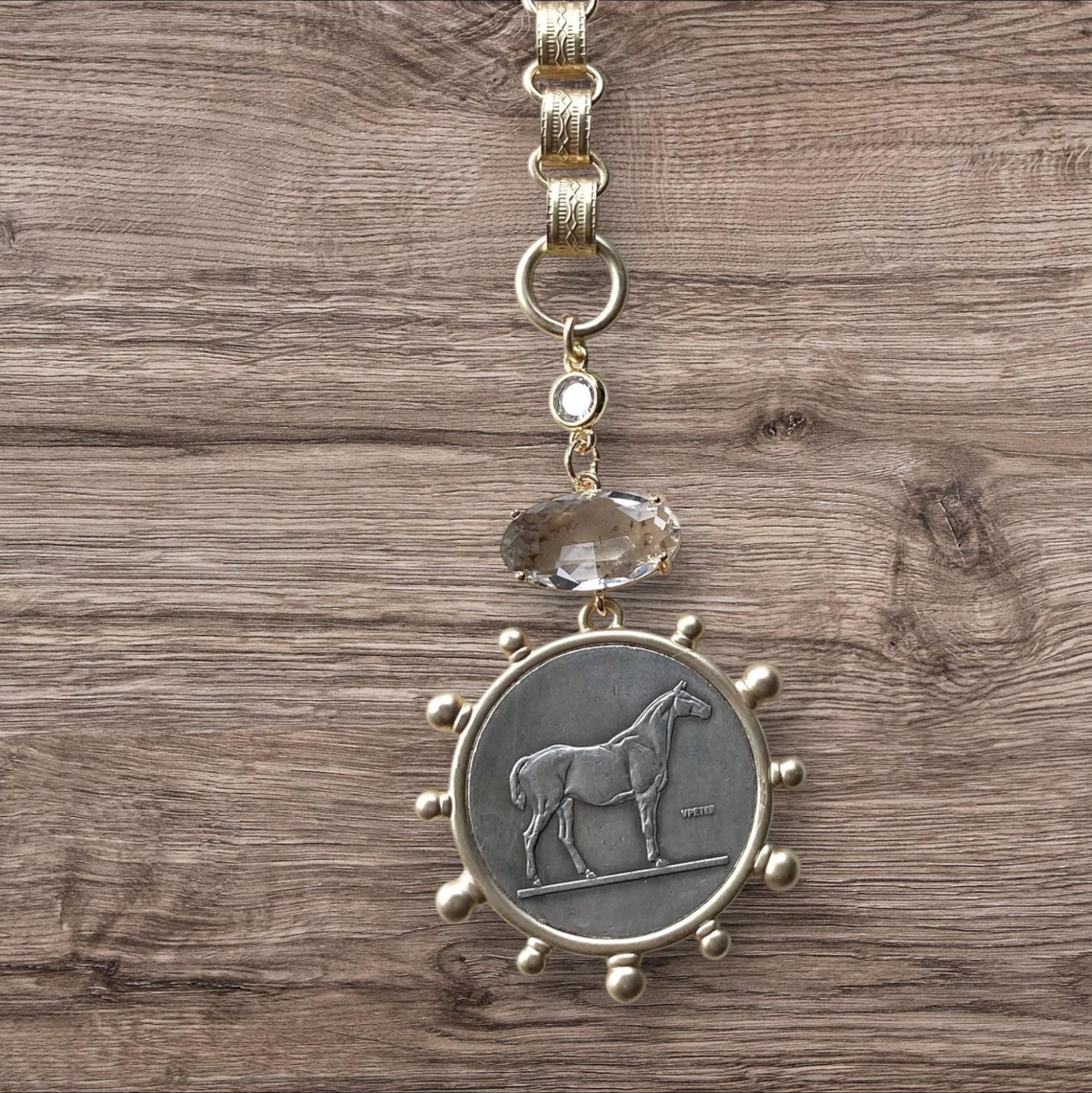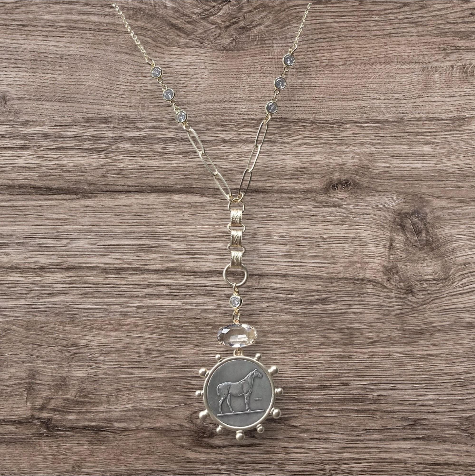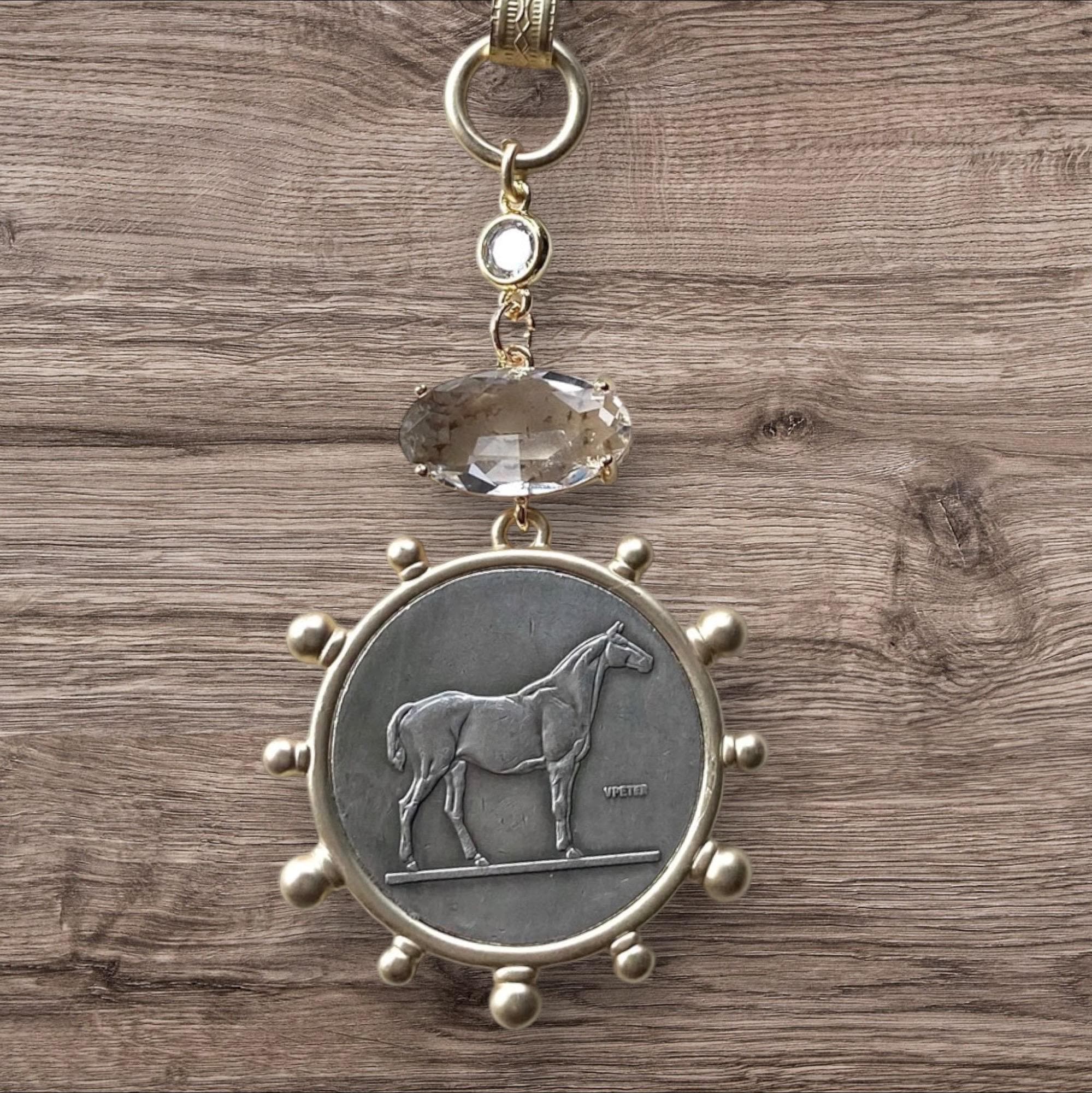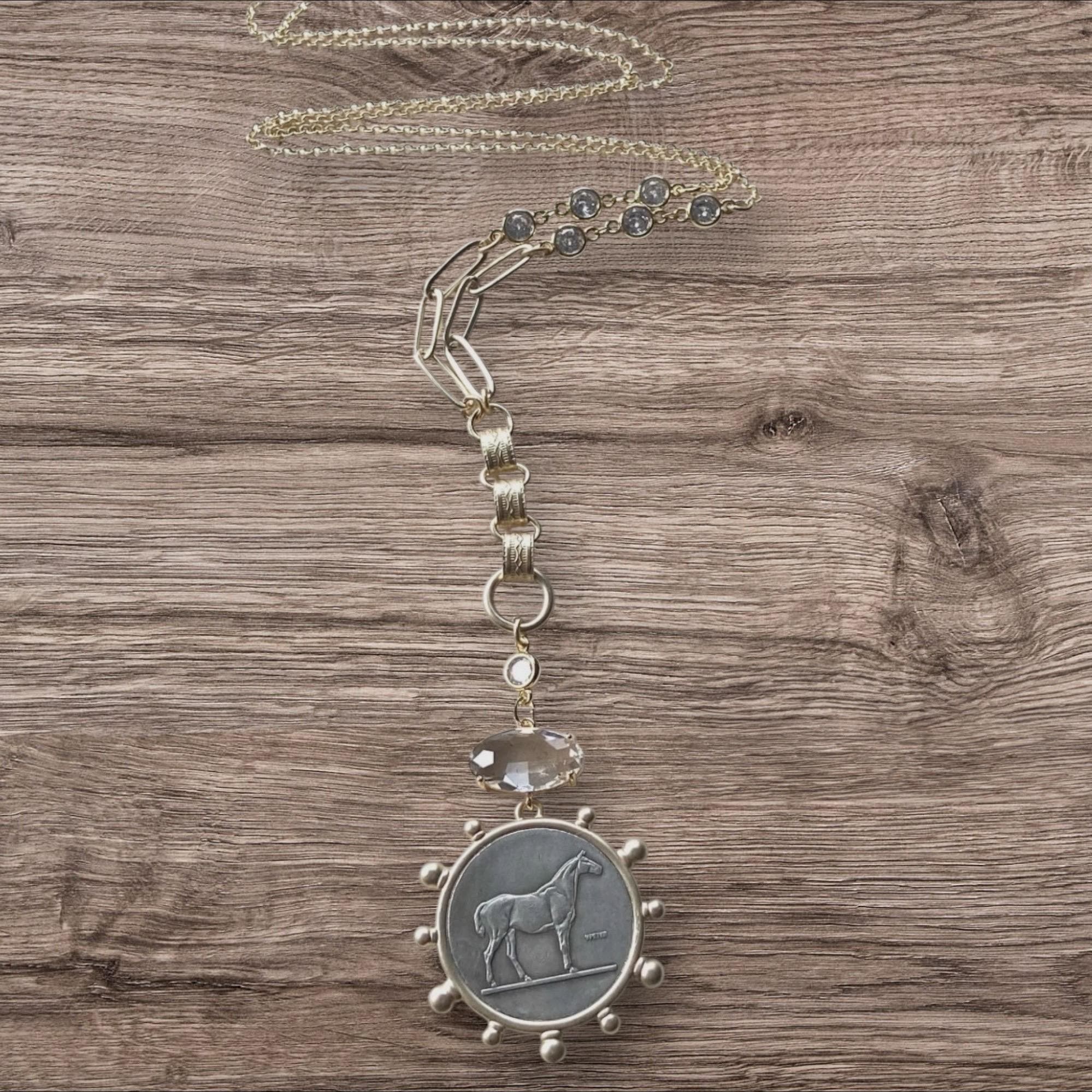 French Horse Coin Necklace • Vintage Equestrian Jewelry • Crystal Quartz Connector (32" Chain)