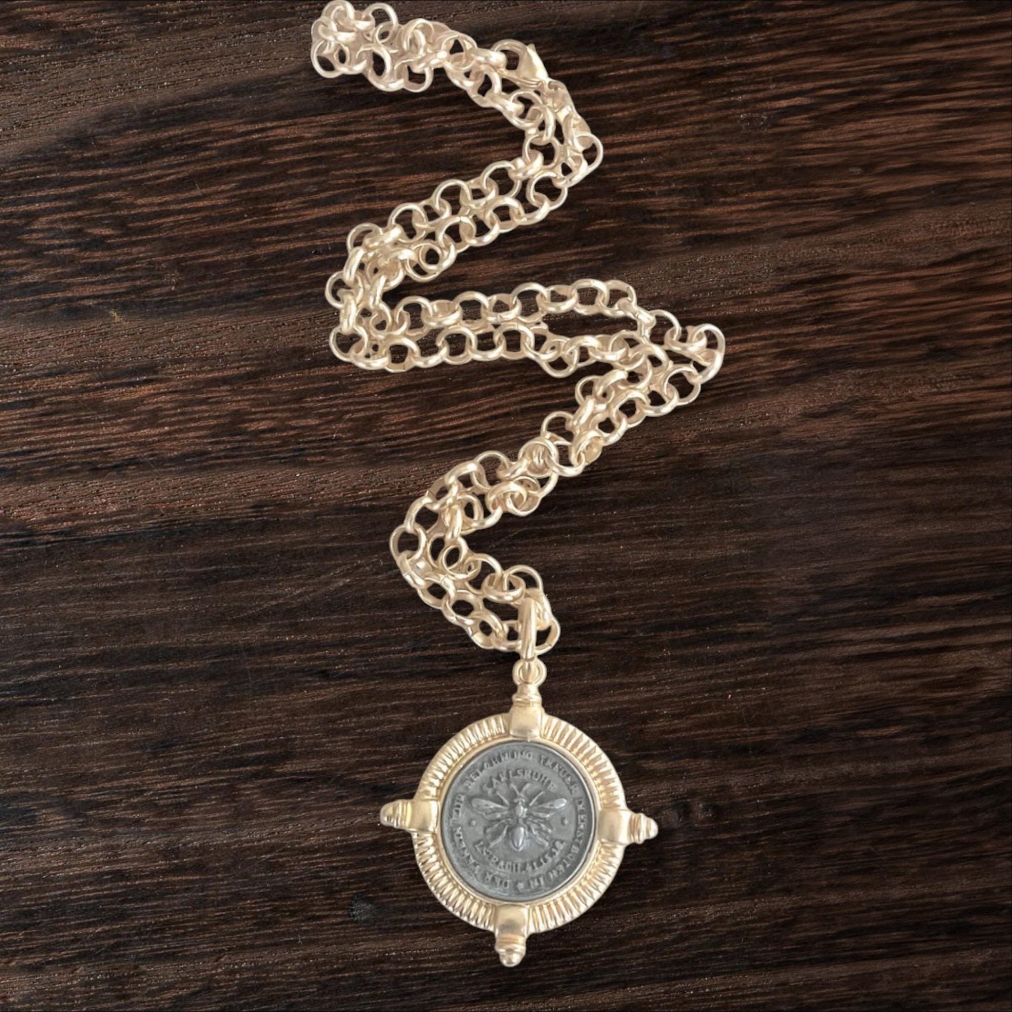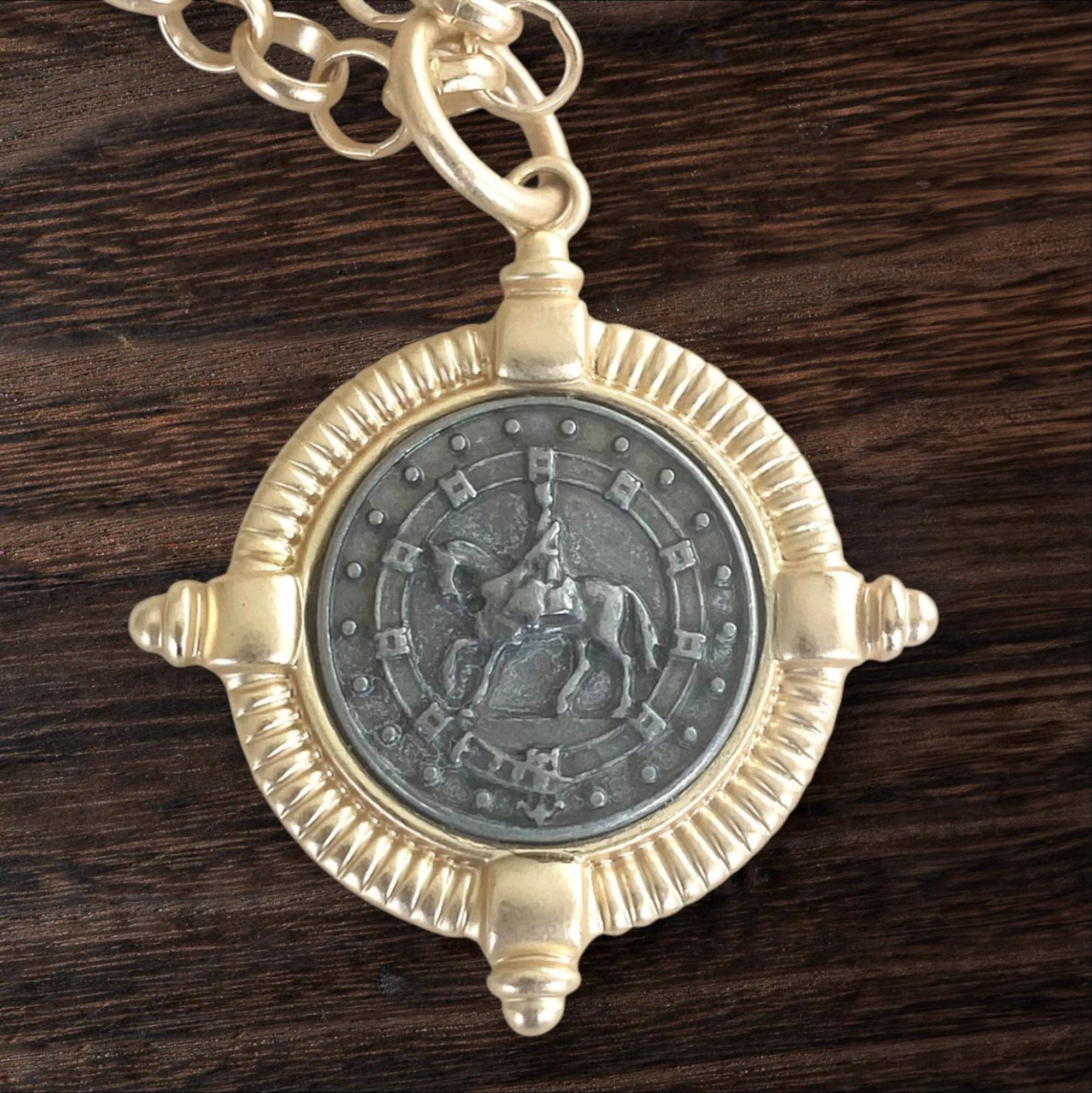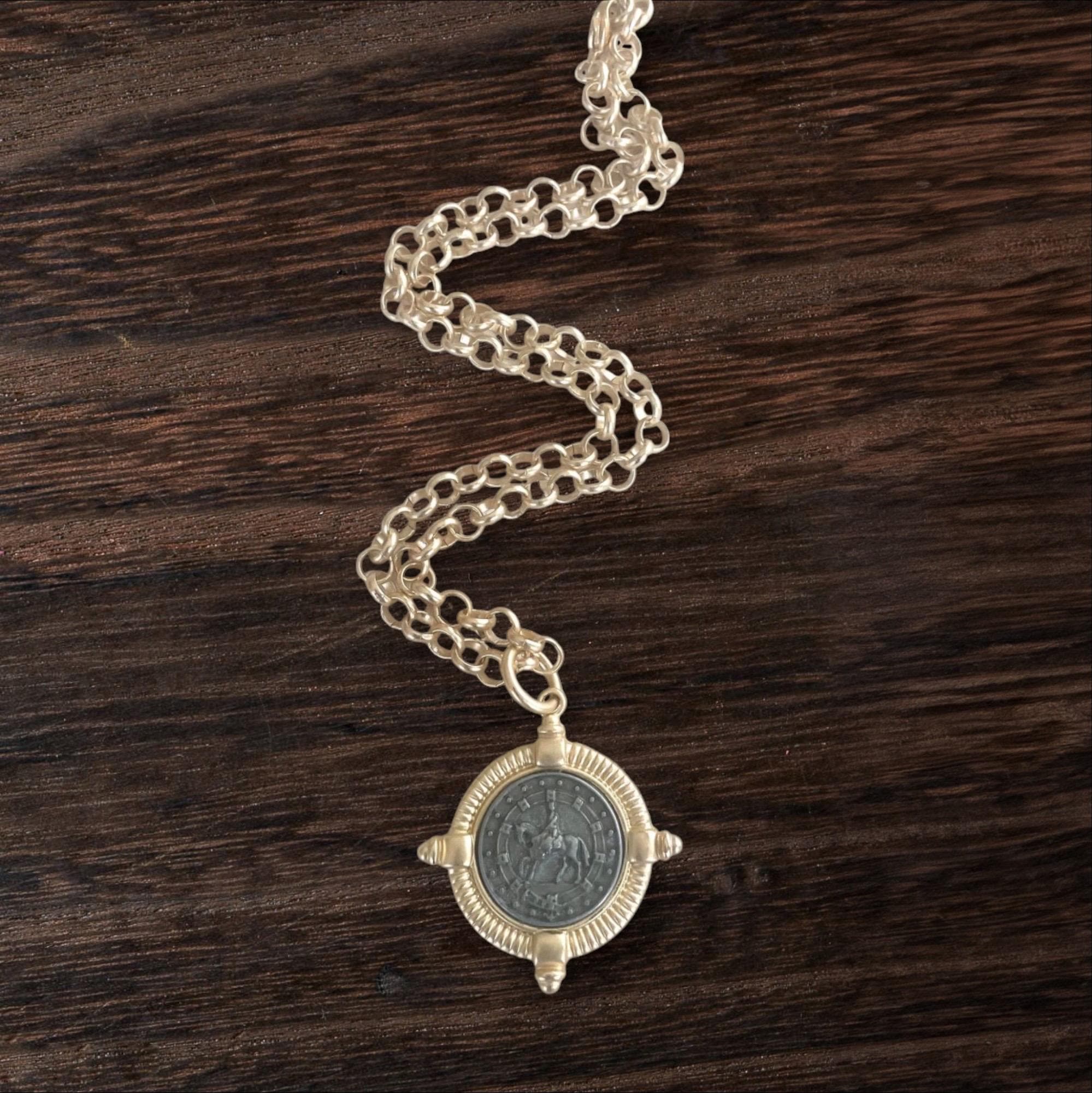 This matte gold horse coin necklace is a timeless piece with bold equestrian character. The detailed coin pendant features a beautifully embossed horse design, framed in a textured matte gold setting that gives it a rich, vintage-inspired look.