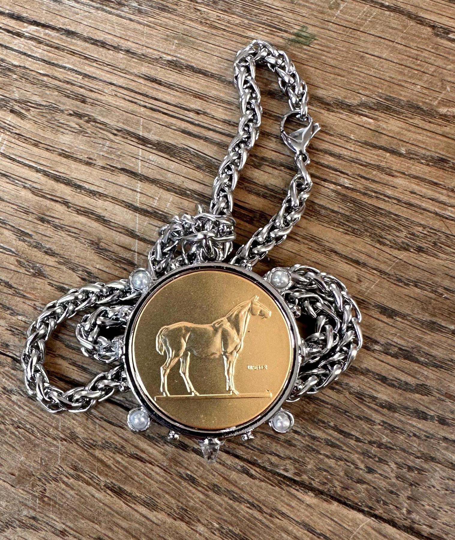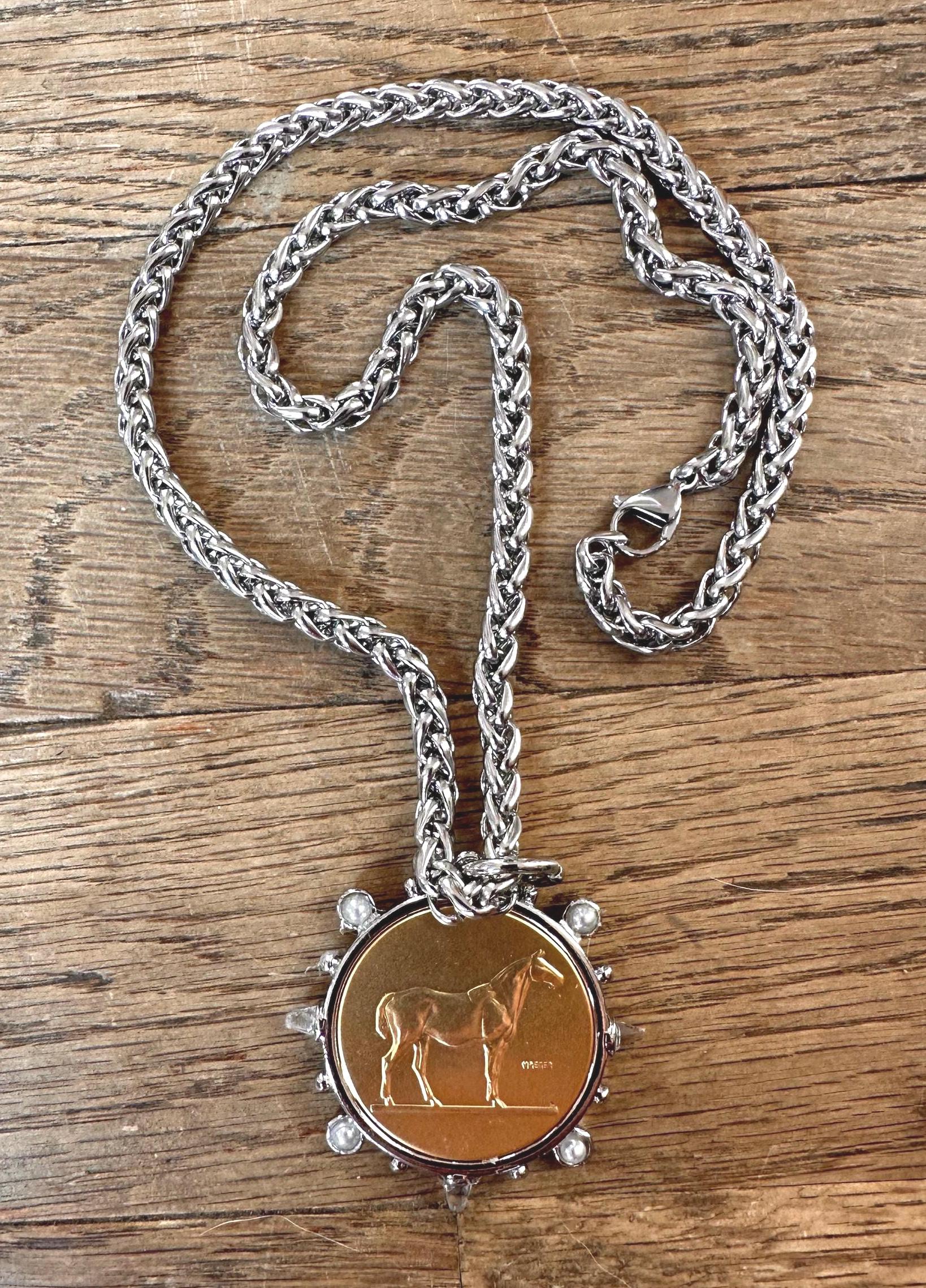 Equestrian Horse Coin Medallion Necklace, Antique Silver Wheat Chain, French Style Pendant