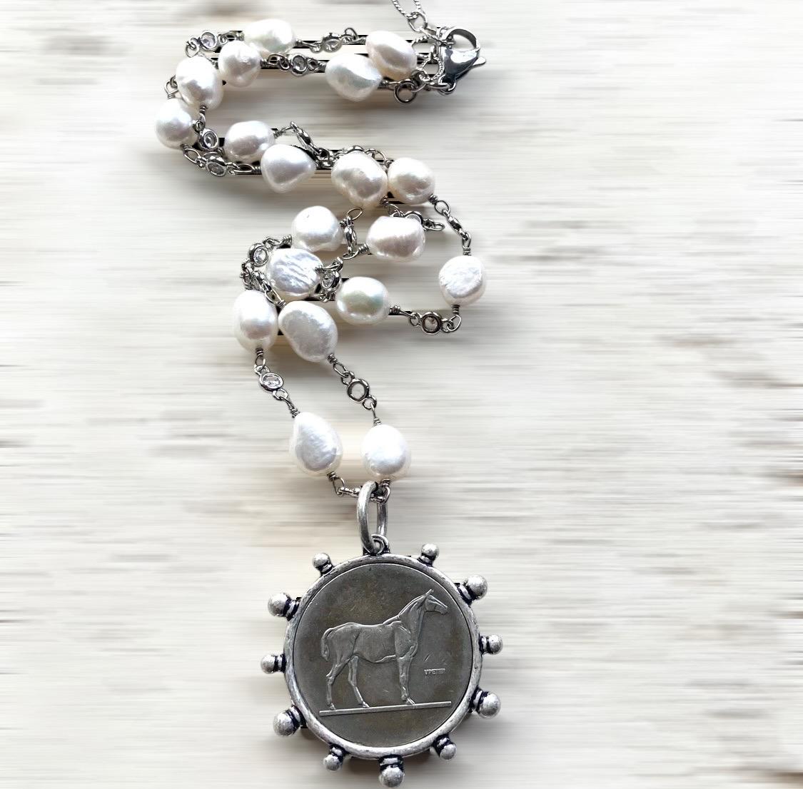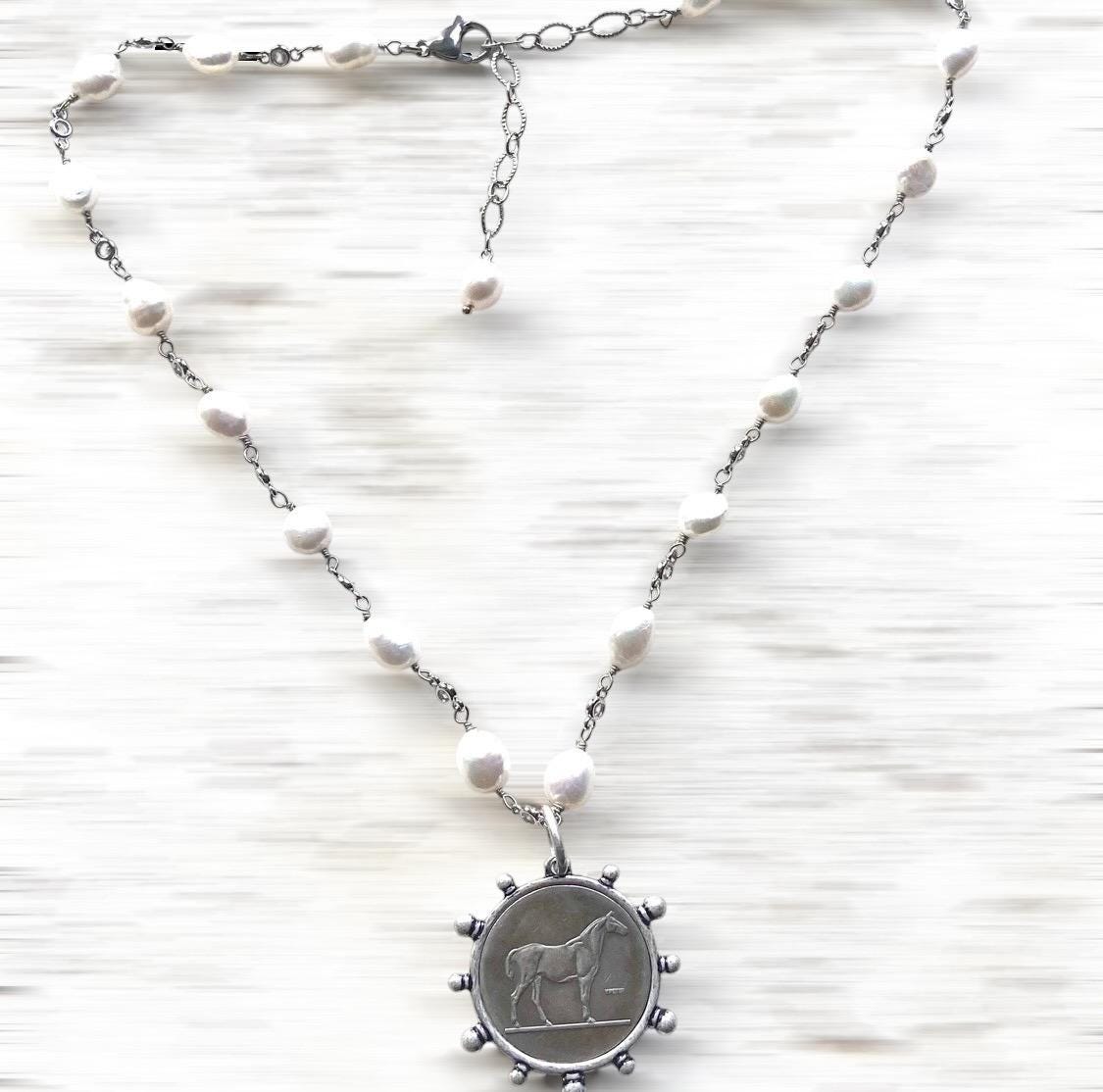 Freshwater Pearl Horse Coin Necklace, Equestrian Statement Jewelry, Antique Silver Pendant